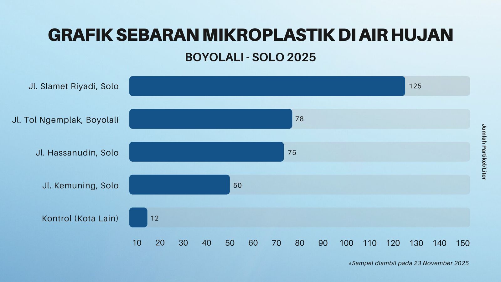 Analisis awal menunjukkan konsentrasi mikroplastik tertinggi berada di Jl. Slamet Riyadi, Solo dengan 125 partikel/liter, disusul Jl. Tol Ngemplak Boyolali (78 partikel/liter) dan Jl. Hassanudin Solo (75 partikel/liter). (Gambar 1)