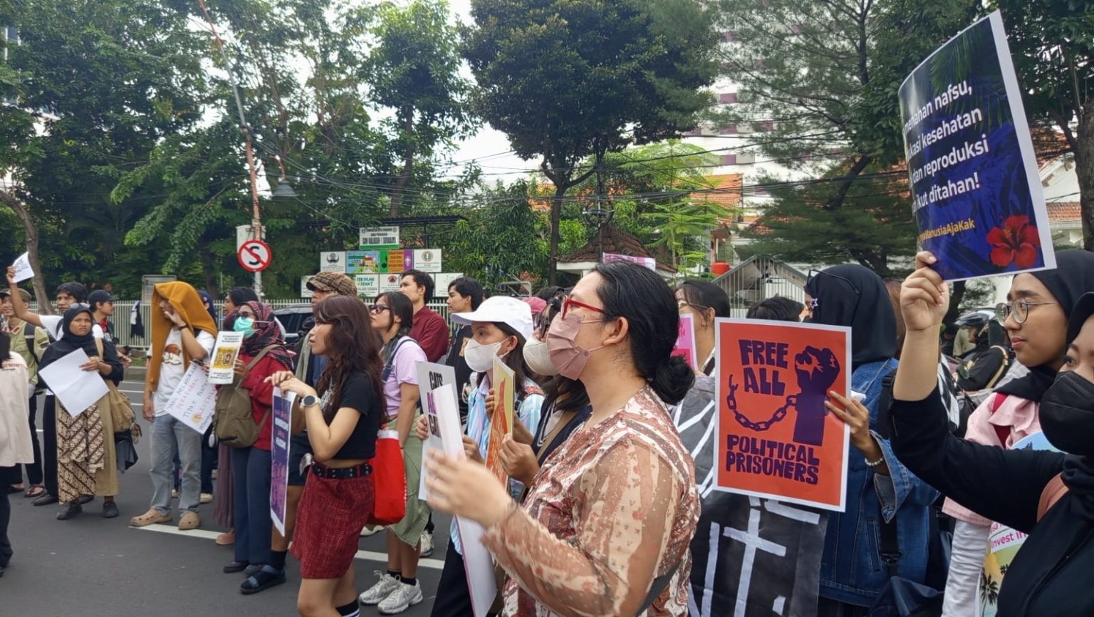 Peserta aksi juga mendesak negara menghentikan segala bentuk diskriminasi, kekerasan, intimidasi, dan kriminalisasi terhadap perempuan baik di ruang publik maupun di ruang digital.
