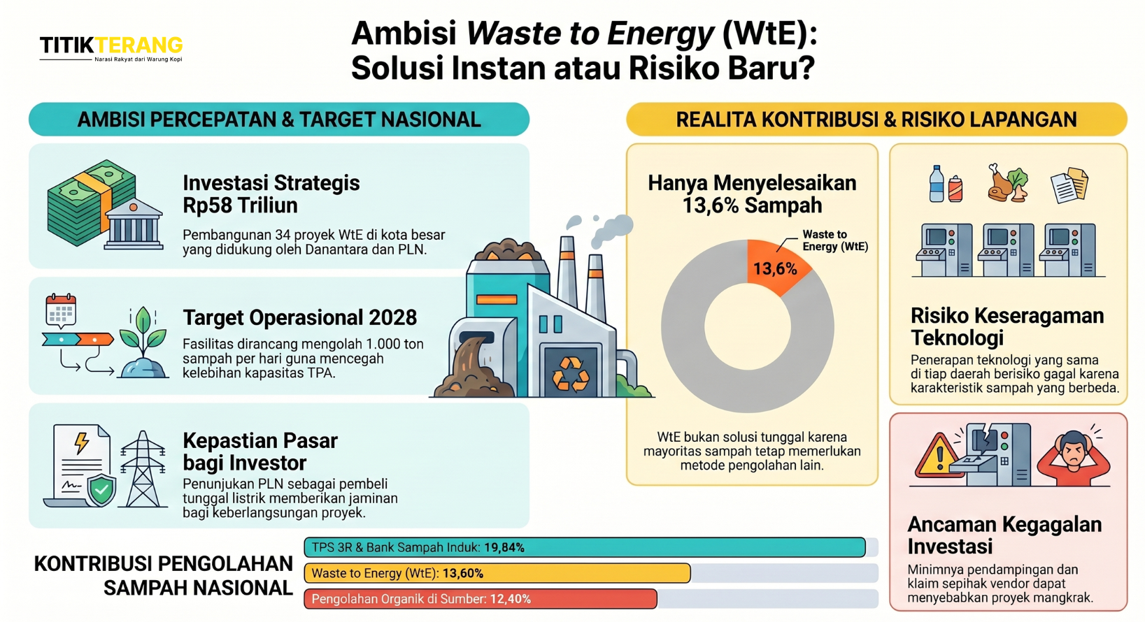 Ambisi besar Waste to Energy digulirkan: investasi triliunan rupiah, puluhan proyek, dan target percepatan nasional. Di balik itu, muncul pertanyaan—apakah ini solusi cepat, atau justru risiko baru dalam pengelolaan sampah? | infografis