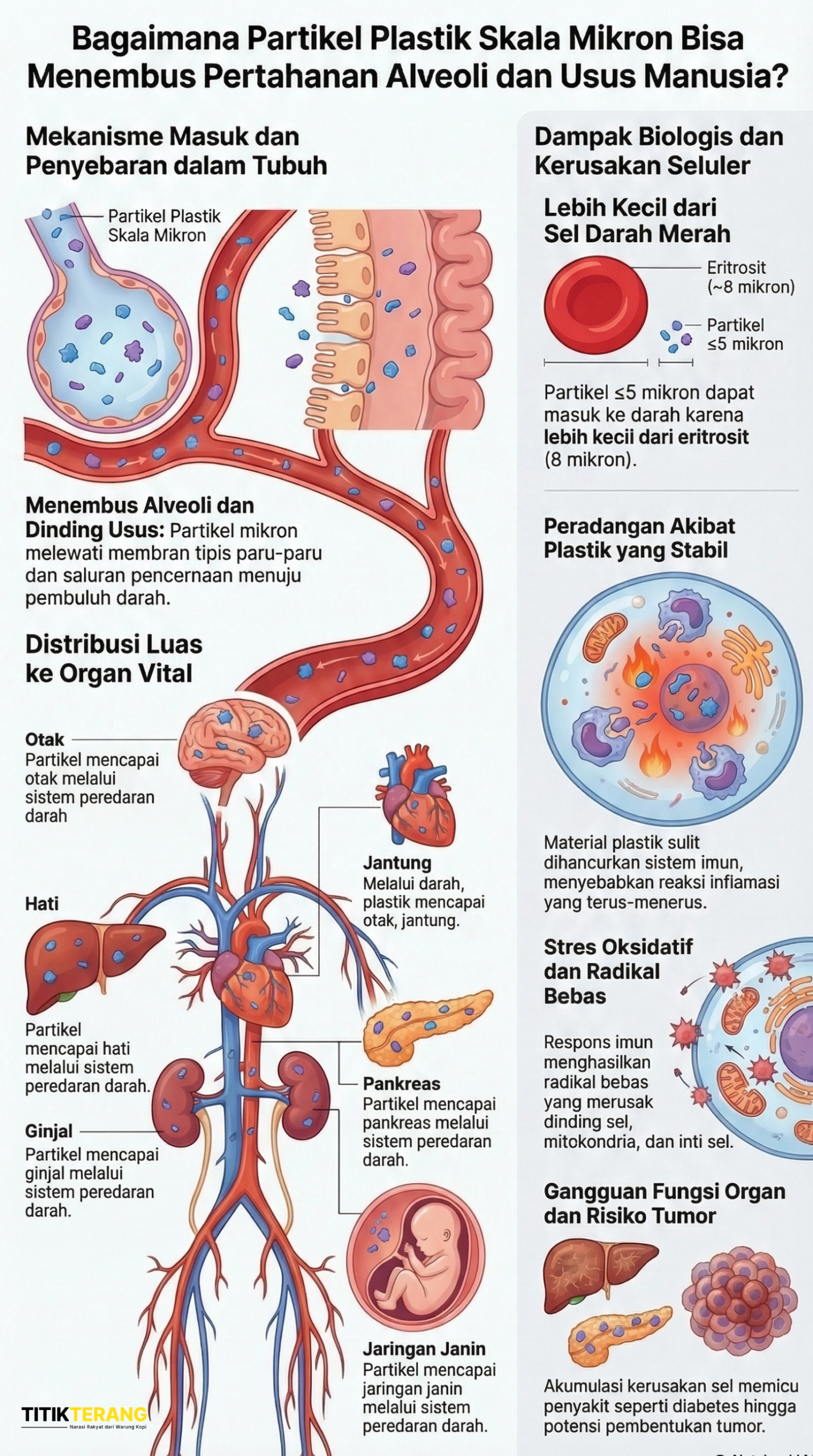 Ilustrasi mekanisme partikel plastik berukuran mikron menembus pertahanan biologis tubuh manusia. Partikel berukuran ≤5 mikron dapat melewati alveoli paru dan dinding usus, masuk ke aliran darah, lalu menyebar ke berbagai organ seperti otak, jantung, hati, ginjal, pankreas, hingga jaringan janin. Material plastik yang sulit dihancurkan sistem imun memicu peradangan, stres oksidatif, dan kerusakan sel yang berpotensi mengganggu fungsi organ. | Desain AI