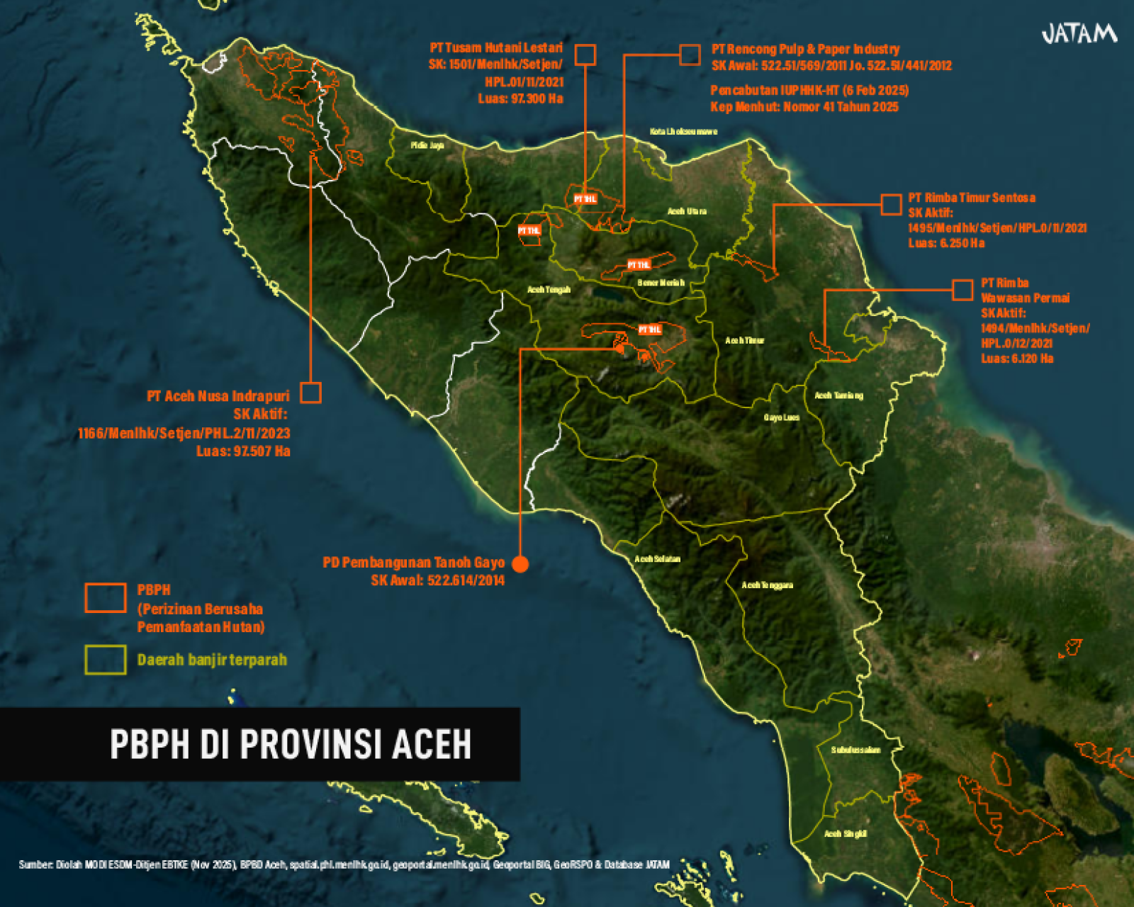 Empat izin konsesi kehutanan di provinsi itu saat ini mencapai lebih dari 207.000 hektare, termasuk PT Tusam Hutani Lestari, perusahaan yang beberapa kali dikaitkan dengan lingkaran politik nasional dan menjadi satu-satunya pemegang izin yang tak dicabut pada evaluasi besar-besaran Kementerian LHK pada 2022.