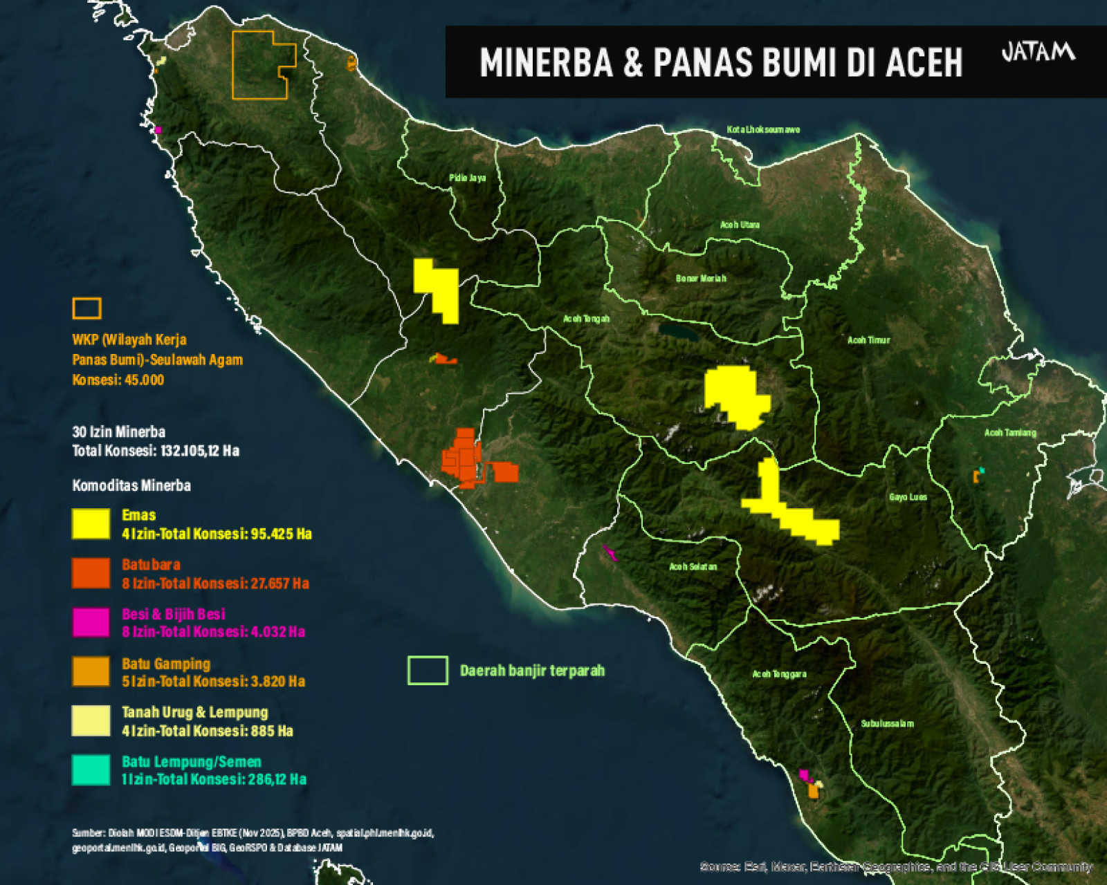 Selain konsesi kayu, Aceh dibebani 31 izin pertambangan seluas 156.000 hektare, belum termasuk lebih dari 3.500 hektare tambang tanpa izin (PETI) yang sebagian besar berada di Kawasan Ekosistem Leuser.