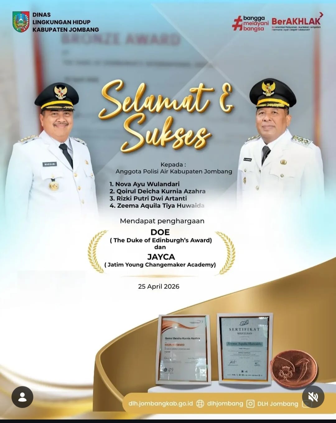 Empat anggota Polisi Air Kabupaten Jombang mendapat apresiasi dari Bupati Jombang, Warsubi, setelah meraih penghargaan dalam program The Duke of Edinburgh’s Award (DOE) dan Jatim Young Changemaker Academy (JAYCA). Ucapan selamat dituangkan dalam bentuk piagam resmi yang diterbitkan Dinas Lingkungan Hidup Kabupaten Jombang.