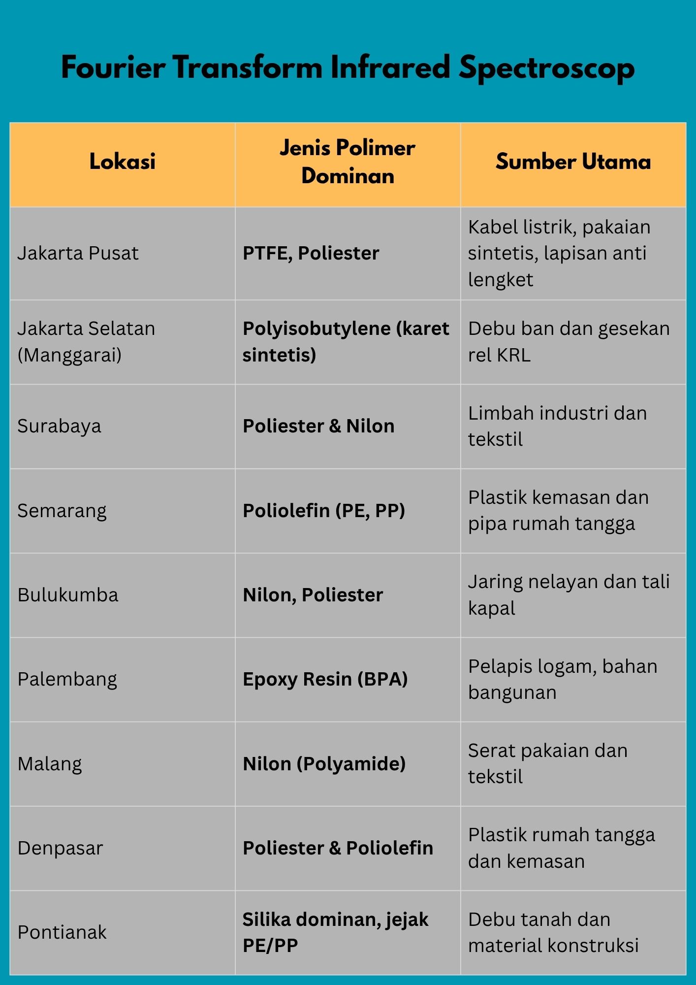Analisis Fourier Transform Infrared Spectroscopy (FTIR) dari ECOTON menunjukkan udara kita berisi berbagai jenis polimer, kayak katalog bahan plastik: