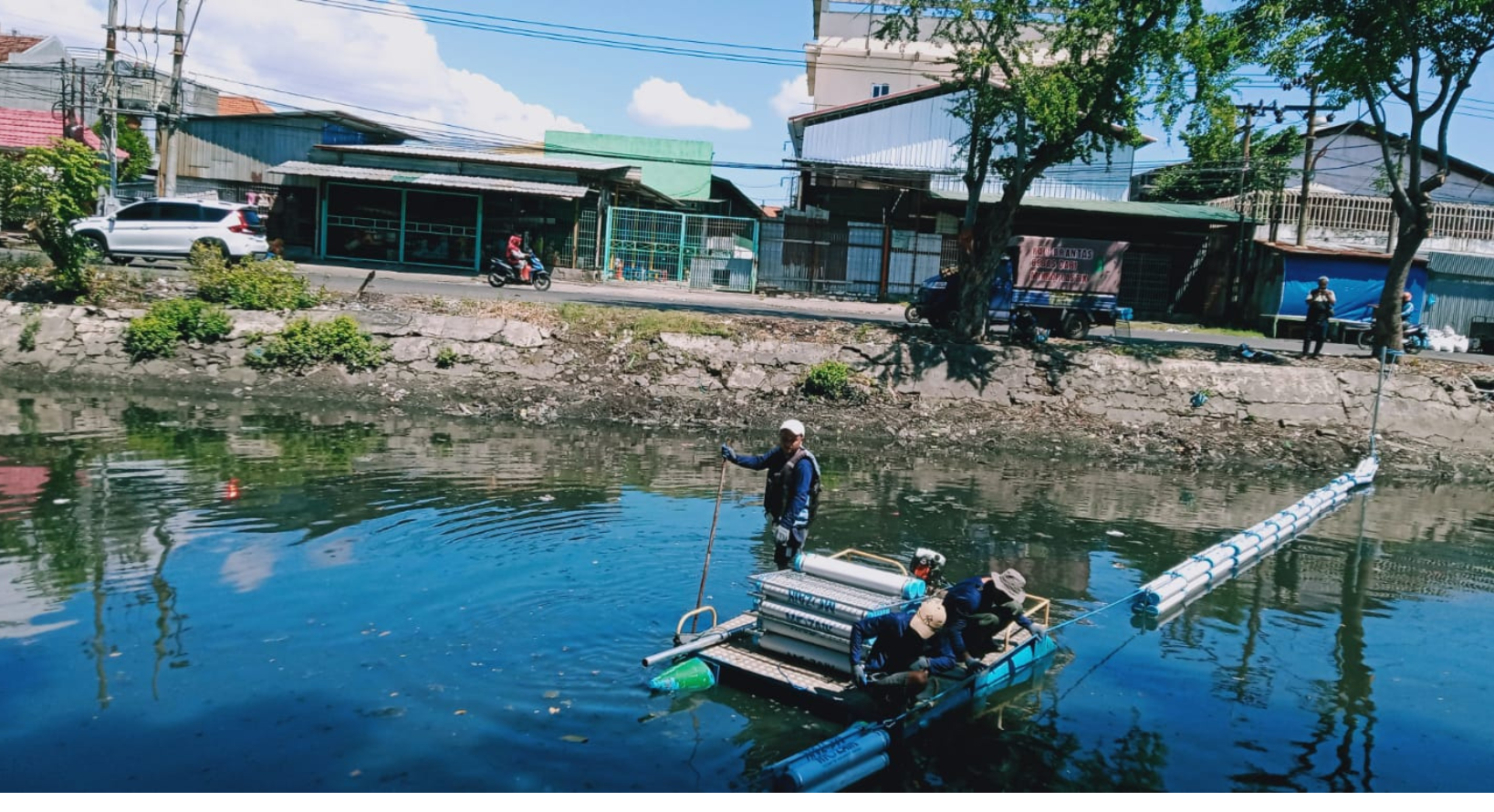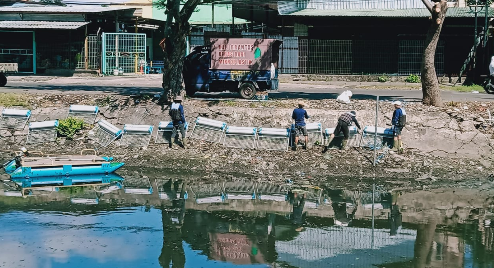Persiapan pemasangan trash boom di Kali Tebu Surabaya dilakukan untuk menangkap sampah plastik sebelum mengalir ke hilir dan mencemari perairan pesisir. | Foto: Supriyadi