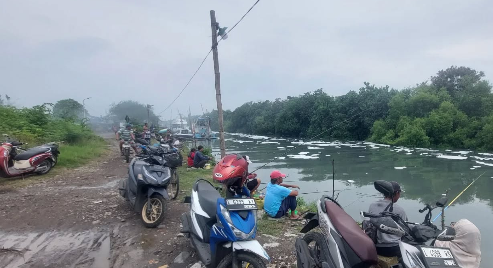 Warga memancing di tepian Kali Tebu di tengah kondisi air yang dipenuhi busa dan limbah, mencerminkan kedekatan sekaligus kerentanan lingkungan sungai terhadap aktivitas manusia. | Foto: Supriyadi