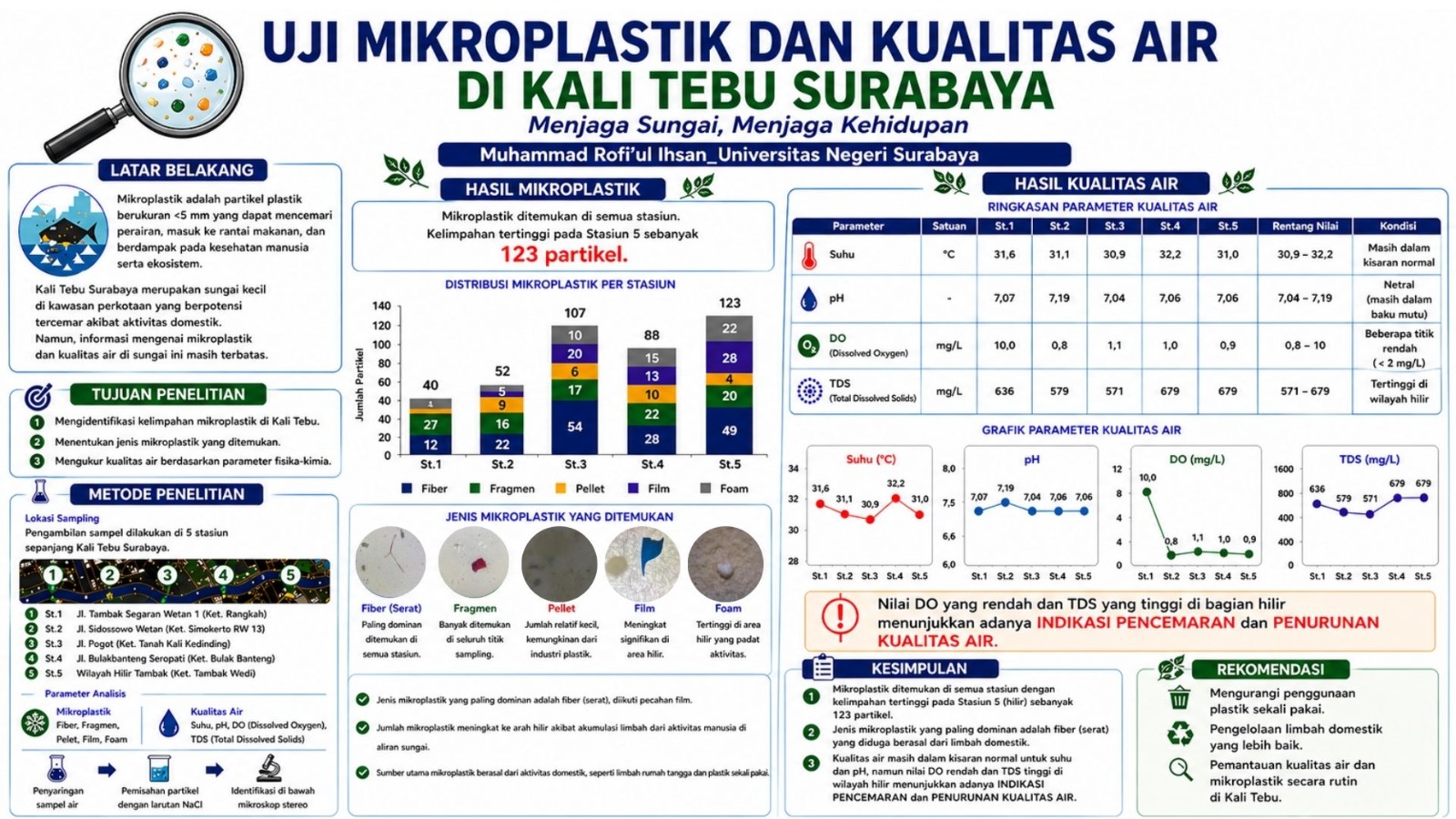 Selain mikroplastik, penelitian ini juga mengukur kualitas air berdasarkan parameter suhu, pH, dissolved oxygen (DO), dan total dissolved solids (TDS). Hasilnya menunjukkan kondisi yang beragam di setiap titik.