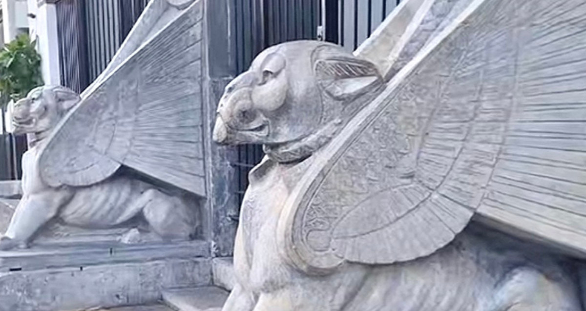 Daya tarik utama gedung ini terletak pada dua patung singa bersayap di bagian depannya. Ornamen itu bukan sekadar hiasan. Ia mengandung makna yang jauh melampaui fungsi estetika.
