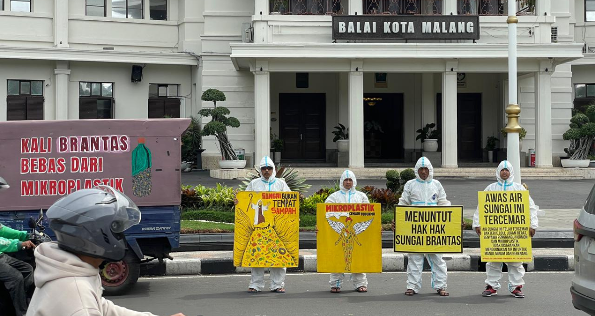 Sebuah mobil bak terbuka mereka jadikan panggung mini, dengan tulisan besar di sisinya: “KALI BRANTAS BEBAS DARI MIKROPLASTIK.” Di depannya, para aktivis memegang berbagai poster berwarna mencolok bertuliskan: “SUNGAI BUKAN TEMPAT SAMPAH,” “MIKROPLASTIK CEMARI TUBUHMU,” “MENUNTUT HAK-HAK SUNGAI BRANTAS,” dan “AWAS AIR SUNGAI INI TERCEMAR.”