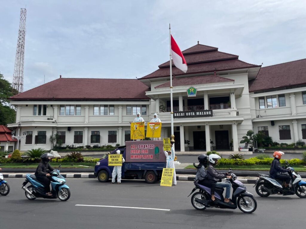 Sebuah mobil bak terbuka mereka jadikan panggung mini, dengan tulisan besar di sisinya: “KALI BRANTAS BEBAS DARI MIKROPLASTIK.” Di depannya, para aktivis memegang berbagai poster berwarna mencolok bertuliskan: “SUNGAI BUKAN TEMPAT SAMPAH,” “MIKROPLASTIK CEMARI TUBUHMU,” “MENUNTUT HAK-HAK SUNGAI BRANTAS,” dan “AWAS AIR SUNGAI INI TERCEMAR.”
