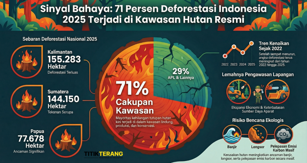 71% deforestasi 2025 terjadi di kawasan hutan resmi. Kalimantan, Sumatera, dan Papua paling terdampak. Tren meningkat sejak 2022, memperbesar risiko banjir, longsor, dan krisis iklim. | Infografis AI
