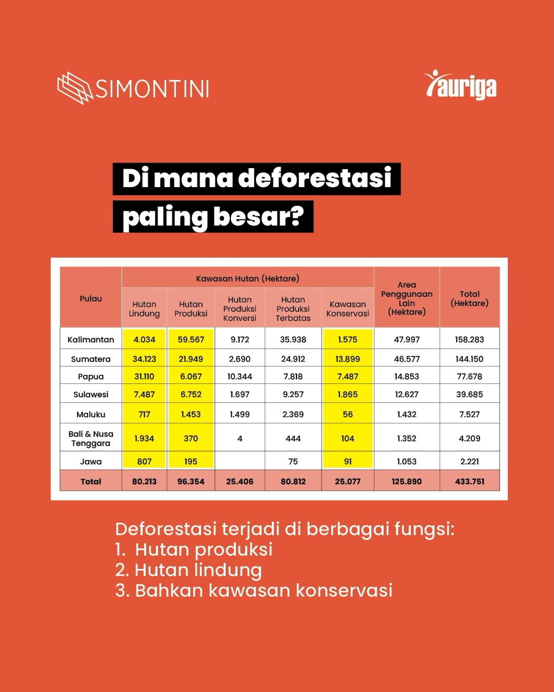 Mitos: deforestasi terjadi di APL. Fakta: mayoritas justru di kawasan hutan negara. Hutan produksi, lindung, hingga konservasi terdampak. Kalimantan dan Sumatera mencatat kehilangan terbesar, perlindungan masih lemah. | Instagram