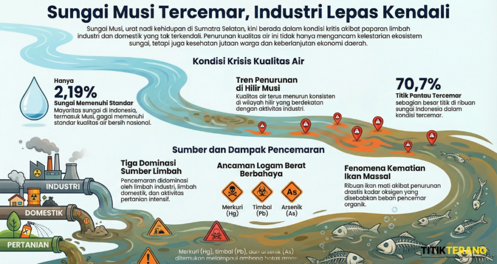 Limbah industri dan domestik terus mengalir ke Sungai Musi. Data pemantauan menunjukkan penurunan kualitas air serius, mengancam ekosistem, kesehatan warga, dan masa depan sumber air Sumatra Selatan.