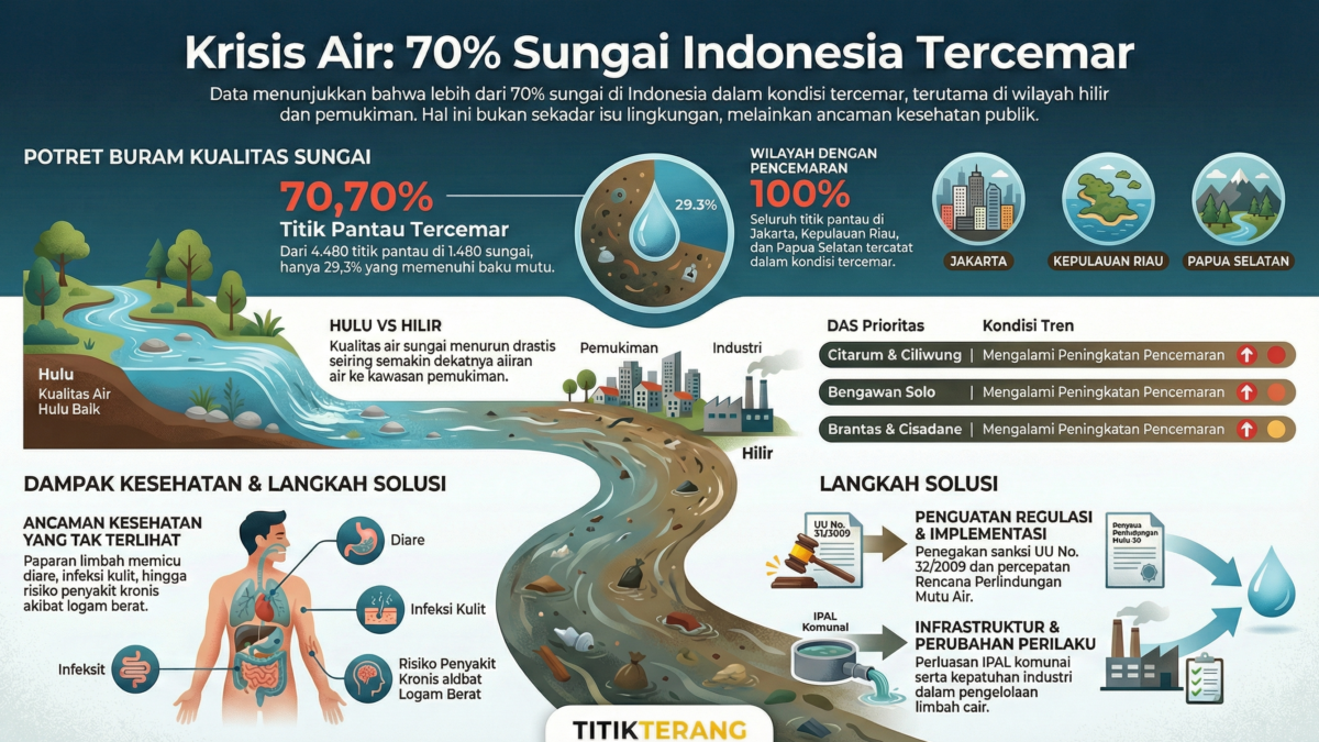 Tujuh puluh persen sungai tercemar. Krisis ini bukan hanya soal lingkungan, melainkan ancaman kesehatan publik yang diam-diam mengalir ke tubuh kita. Sungai sering kita pandang sekadar bentang alam yang dilewati jembatan, dilintasi kendaraan, lalu dilupakan. Padahal, sungai adalah cermin paling jujur dari cara kita memperlakukan lingkungan—dan, pada akhirnya, tubuh kita sendiri. Ketika Kementerian Lingkungan Hidup (KLH) mencatat 70,70 persen titik pantau sungai di Indonesia berada dalam kondisi tercemar, bisa jadi itu bukan hanya temuan angka. Tapi angka itu menyiratkan cerita tentang air yang kita gunakan, makanan yang kita konsumsi, dan risiko kesehatan yang kita warisi. Dari 4.480 titik pantau di…