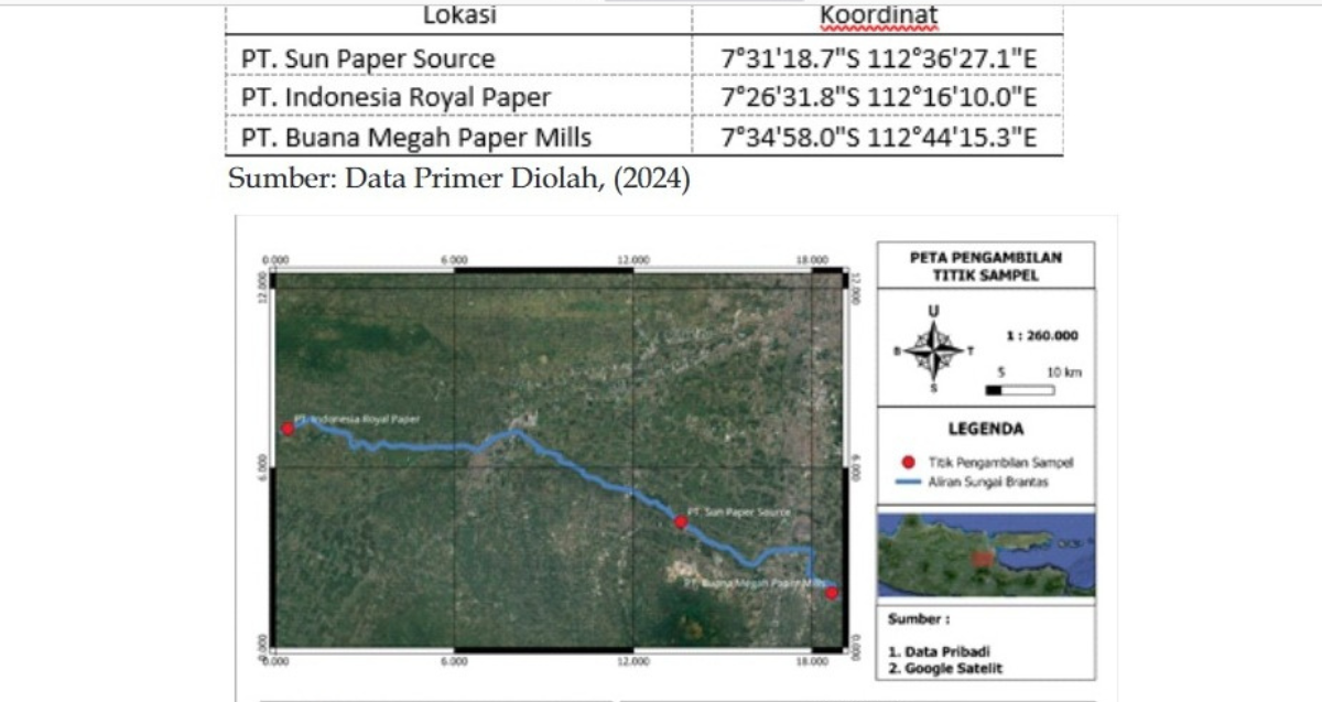 Penelitian yang dilakukan pada Juli 2024 dengan mengambil sampel air di tiga lokasi industri kertas, yakni PT Sun Paper Source di Kabupaten Mojokerto, PT Indonesia Royal Paper di Kabupaten Jombang, dan PT Buana Megah Paper Mills di Kabupaten Pasuruan.