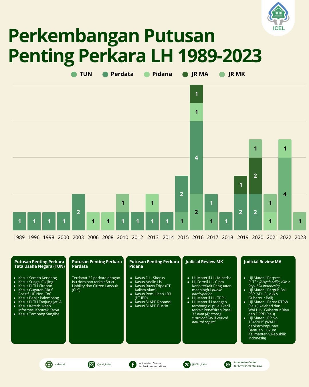 Peluncuran laporan Putusan Penting Perkara Lingkungan Hidup Indonesia: Potret Tiga Dekade untuk Penguatan Hukum Lingkungan oleh Indonesian Center for Environmental Law (ICEL) pada 11 Desember 2025 menandai tonggak penting dalam dokumentasi hukum lingkungan nasional. Melalui inisiatif Indonesian Landmark Environmental Decisions (I-LEAD), laporan setebal 178 halaman ini mengkurasi 44 putusan penting sepanjang 1989–2023, rentang waktu yang mencerminkan evolusi panjang praktik peradilan lingkungan di Indonesia.