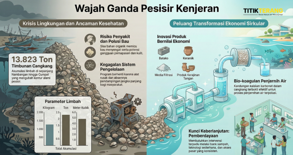 Jika pengelolaan limbah tidak segera dibenahi, angka 13 ribu ton timbunan cangkang hanya akan terus bertambah—menjadi monumen diam dari kegagalan mengelola keberlimpahan. Tetapi jika inovasi dan pemberdayaan dijalankan secara serius, cangkang kerang justru dapat berubah menjadi simbol transformasi ekonomi pesisir yang berkelanjutan.***